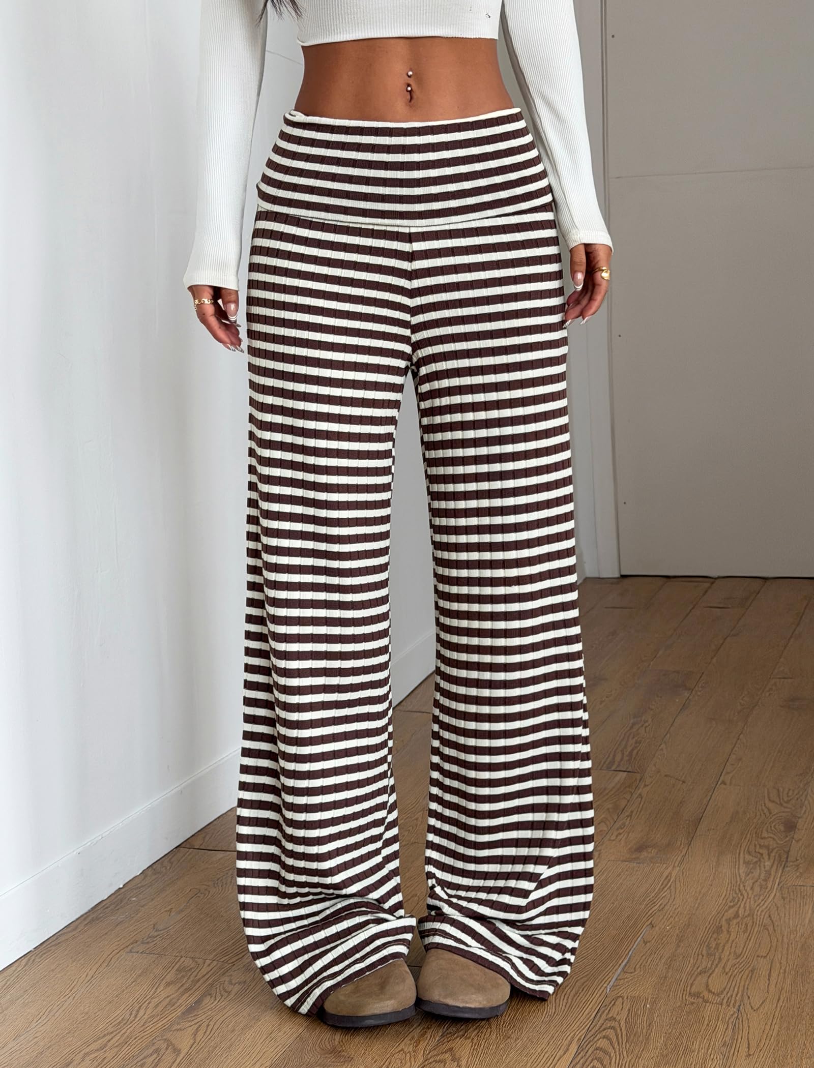 ZAFUL Women's Striped Pants Casual Fold Waist Wide Leg Pants Lightweight Comfy Stretchy Loose Lounge Pajama Pants